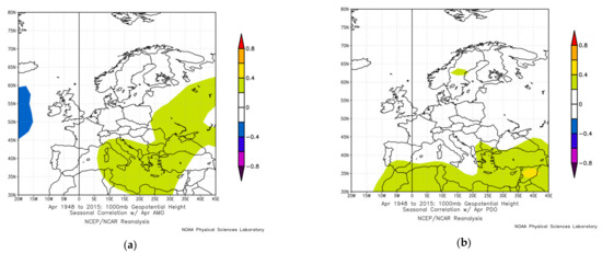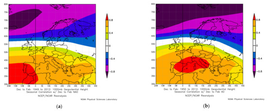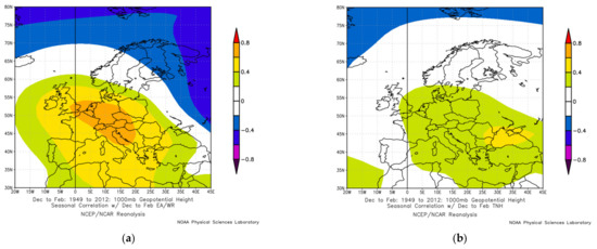 Examples of spatial correlations between teleconnection indices and the 1000 hPa geopotential height were obtained using an online plotting tool of the NOAA Physical Sciences Laboratory available at https://psl.noaa.gov/data/correlation/ (accessed on 13 September 2021), which plots correlations of seasonally averaged variables from the NCEP reanalysis with specified teleconnection and ocean index time series for the 1948–2012 period.