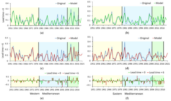As already mentioned, the Mediterranean climate is characterized by both decadal-multidecadal (referred to as low-frequency) and interannual (referred to as high-frequency) fluctuations. In this study, the approach used was to decompose the original parameter into the orthogonal signals (low-frequency and high-frequency) with subsequent modeling of each signal separately. As was shown earlier in [67,78], the number of input indexes is limited by computing power, so this approach allowed us to increase the number of predictors (input teleconnection indices) and, consequently, to improve the quality of modeling.