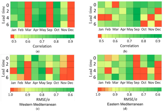 So, the main aim of this work was to study the variability and predictability of intense cyclones over the Mediterranean region associated with teleconnection patterns. The tasks of the work were to obtain, compare, and analyze monthly, seasonal, and annual time series of the frequency of intense cyclones over the Western and Eastern Mediterranean (Section 3.1), to estimate seasonal and annual linear trends (Section 3.2) and spectral periods (Section 3.3), to assess correlations with global and regional teleconnection indices (Section 3.4), and to test predictability with an artificial intelligence model (Section 3.5). The main advantages of the work are that, using simple approaches, we obtained and analyzed the activity of cyclones exceeding a particular threshold by intensity (75th/95th percentile) for the western and eastern parts of the Mediterranean region, showed the sets of the main global teleconnected predictors for them, and identified the months with the best predictability of intense cyclones using an artificial neural network model.