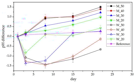 Lab-scale trials were conducted on a total volume of 500 mL (manure + additive). Changes in pH value of the different solutions over time are shown in Figure 1. It is clearly visible that the control and the flushing milk samples show a steady increase in pH over time. While the control starts at a pH of 7.11 (which could be expected for diluted manure), the milk samples start between 5.13 (for 50%) and 6.17 (20%), but all show a uniform development towards a pH of 7 (milk samples) or 7.4 (reference), again moving to the natural pH range of manure. The addition of whey on the other hand shows a decrease of pH for a certain time, again depending on the concentration. In general, the starting pH of whey samples is in the range of milk samples (between 5.15 and 6.15). However, compared with the milk samples, the whey ones develop towards neutral pH much slower. For 50% and 40% whey, the pH value after 22 days was still below 6, effectively mitigating emission of NH3 almost entirely []. The lowest pH for the samples was observed after 1 week for 50% and 40% whey at 3.98 and 4.73, respectively. The overall lower pH when using whey can be traced back to lactic acid from lactic-acid-producing bacteria (LAB) in the (acidic) whey []. Whey as source of LAB was summarized by Rama et al. in 2019 [], yet Burns showed that the addition of yeast to the whey has beneficial effects on the growth [].