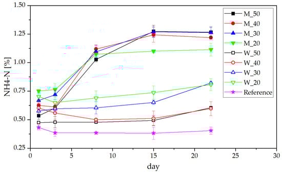 Monitoring of ammonium nitrogen (NH4-N) in different manure mixtures showed interesting results, as depicted in Figure 2. First of all, NH4-N content in untreated manure sludge did decrease slightly in the first 3 days, afterwards remaining constant at roughly 0.4 kg N per ton of fresh manure (kg/t). For all whey-containing samples, the increase in NH4-N amount was very small (on average 0.15 kg/t), after a slight initial decrease. This could be traced back to the proteolytic capability of some strains of LAB []; furthermore, they allow for the fermentation of proteins into amino acids and subsequently NH4-N []. Although the pH of whey mixtures was lower, increase in NH4-N content of milk mixtures was higher. The biggest change was recorded for M_50 from 0.53 kg/t to 1.26 kg/t, effectively more than doubling the NH4-N content. One reason might be the pH-dependent hydrolysis of urea into ammonia, as shown by Fidaleo et al. in 2003 [], which is most successful at around pH 6–8.