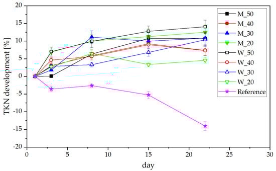 Results from the determination of total Kjeldahl nitrogen (TKN) are shown in Figure 3 as relative development over time compared to day 1, as the absolute nitrogen contents vary between 2 and 5% N on a dry basis. All samples that were mixed with dairy by-products did retain their nitrogen content or showed an increase in nitrogen detectable by the Kjeldahl method, while the untreated sample showed a strong decrease in TKN of roughly 14% over 22 days. These observations correspond to previous findings []. The relatively steady amount of NH4-N combined with a loss of TKN shows that the conversion of urea into ammonia is not hindered in untreated manure, and N is lost in the form of gaseous emissions to the surrounding atmosphere. On the other hand, the steady development of TKN compared with an increasing amount of ammonium nitrogen indicates an ongoing nitrogen preservation within the dairy-manure, allowing it to be accessible for plants after spreading on the field.