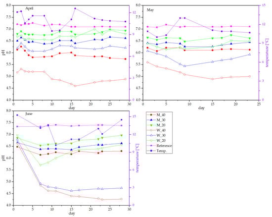 On a larger scale, a total volume of 20 L for each manure/dairy mixture was prepared, and the pH was monitored for up to 1 month. Three measurement series were conducted in April, May, and June. The development of pH for all three setups is shown in Figure 4. Independently of the dilution with water, manure presented the highest pH, between 7 and 7.5, which did not alter much during the whole period. Addition of various percentages of flushing milk did again lower the pH depending on the amount in the range of 6 to 7, as already observed in the lab-scale trials. Contrary to the observations in the lab-trials, a smaller increase in pH was observed for the flushing milk samples over time, keeping the pH levels lower for a longer time. Once more, acidic whey addition did lower the pH to a higher extent than did flushing milk. For 30% and 40% whey, a reduction to an initial pH of 5.5 and 6 was observed, respectively. Within the first week, the pH decreased further depending on the surrounding temperature, which likely influences the growth of LAB [,]. As observations concerning pH development in the large-scale experiments mostly matched those in lab-scale monitoring, it could be assumed that the preservation of nitrogen functions in the same way.
