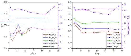 Naturally, the solid content of flushing milk shows strong fluctuation depending on its source. When flushing milk is obtained from cleaning milk trucks, a low solid content is reported (below 1%), but when it is derived from cleaning the tubing after production of high-fat products (yoghurt or other desserts), the solid content can be up to 10%. As the solid content effectively represents an additional dilution factor, it does have a strong influence on the pH reduction ability. In Figure 5, a comparison of the addition of 40%, 30%, and 20% flushing milk with a solid content of 0.1% (left panel) and 9.7% (right panel) is shown. While no effect of the flushing milk with low solid content (M_%%_ls) was observed, the pH reduction for the high-solid-content milk (M_%%_hs) was still observable after 28 days to a value below 5.5. These results suggest that a higher solid content in flushing milk does reduce the pH for a longer time, as all other trials were conducted using flushing milk with a solid content of roughly 3.5%.