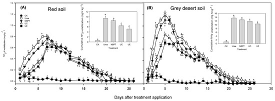 In this study, ammonia volatilization rapidly increased, peaking on day six after urea application (Figure 1). The cumulative amounts of NH3 volatilized in the grey desert soil and the red soil during the urea treatment experiment were 13.5 and 9.3 mg N kg−1, respectively. NH3 volatilization decrease (6–45%) caused by the urease inhibitors were within previously reported ranges for agricultural systems (3–57%), suggesting that the inhibitors resulted in a reduction in the rate of urea hydrolysis, thereby reducing NH3 volatilization [34,35,36]. This finding was evident with a higher urea content in soil treated with urease inhibitors compared to the urea-only treatment during the first 20 days after fertilizer application (after which urea content in the soil became negligible). The reduction in urea hydrolysis caused by urease inhibitors was further evidenced by higher NH4+ contents in the inhibitor treatments than in the urea-only treatment throughout the experiment.