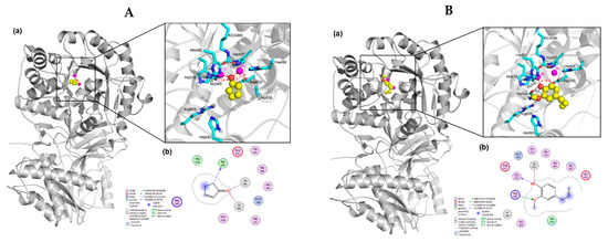 (A) Docking structure (a) and 2D representation of binding mode (b) of 2-Cyclopenten-1-one; (B) Docking structure (a) and 2D representation of binding mode (b) of Eugenol. Amino acids are highlighted in light blue, each inhibitor compound is highlighted in yellow. Hydrogen bonds are presented as light dotted lines.