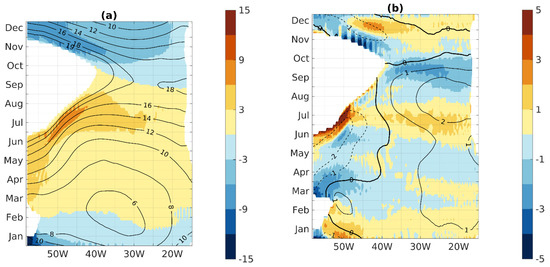 Importantly, since the zonal asymmetry of V is verified by V*, one is allowed to discuss the main causes of this fundamental feature. Regarding NB, Figure 4a demonstrates that the migration velocity decreases eastward due to an overall increase of the norm of , generally about twice larger than the changes of . This zonal contrast in is evidently due to the presence of cold water to the northeast of the NB migration domain, maintained by the Canary upwelling system.