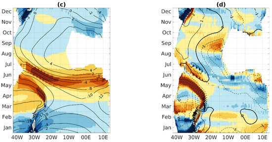 Several studies have successfully used the NEMO model to study tropical Atlantic SST, in the present configuration [13,33,51] or a comparable one [45]. In the present paper, we focus our work on the meridional velocity V and latitudes of the two AWP meridional boundaries NB and SB. Figure 3 presents time–longitude diagrams of V and latitude, for each meridional boundary, in order to describe them with further details, and compares them with observations. Note that white shading indicates that the 27 °C isotherm is not defined within our domain of study. As observed previously, the highest migration velocities are in the west for NB (Figure 3a) and to a slightly lesser extent for the SB (Figure 3c). The NB migrates poleward from about 6° N up to north of 30° N (out of our model domain), from February to September–October. While the SB migrates poleward from about 28° S in the west and 12° S in the east up to 4° N in the east, from April to August.