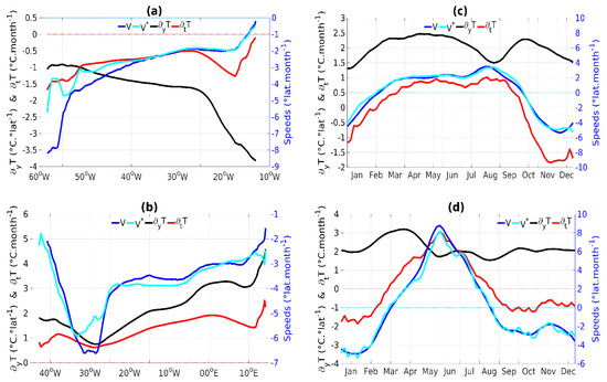 Most strikingly, the meridional extension of the AWP is wider in the West, reaching as far as 25° S and 25° N, than in the East, limited to 10° S and 15° N (Figure 1). As shown in simplified model experiments [40], this western enlargement is caused by Ekman’s transport towards the poles, and its effect is opposed in the east by the equatorial upwelling cooling. However, it is clear from the orientation difference of wind vectors in Figure 1 that the asymmetry also comes from the more poleward character of this transport in the west, and we will demonstrate this later by measuring the advective contribution to the migration. The role of the eastern upwellings, the equatorial and the two Africans can also be assessed quantitatively as they participate in maintaining strong meridional SST gradients, which have a blocking capacity for meridional AWP movements. Indeed, Equation (4) shows that the V* is inversely proportional to the local , that therefore tends to reduce the migration speed. We will quantify this process in detail in Section 3.2.2.