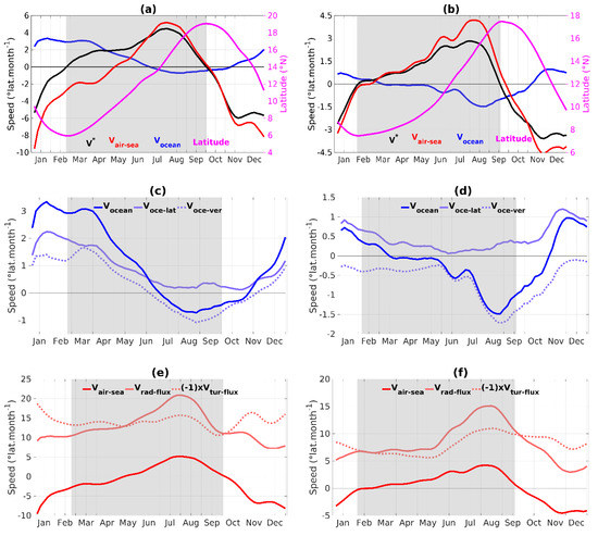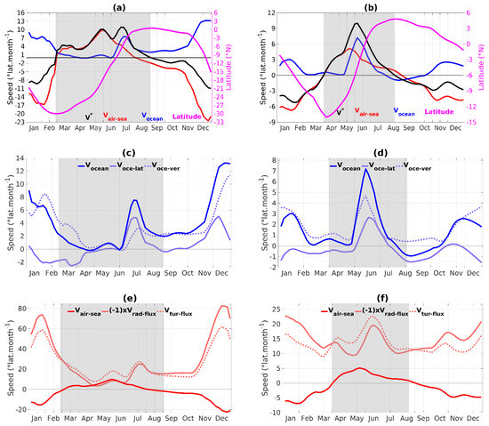 Velocity contributions (°lat.month−1) for NB, averaged over the W30 (left) and E30 (right) sectors. (a,b) Total velocity (V*, black), contributions of air–sea fluxes (Vair-sea, red) and oceanic processes (Vocean, blue), and NB latitude (magenta). (c,d) Contributions of lateral oceanic processes (Voce-lat, light blue) and vertical oceanic processes (Voce-ver, dashed light blue). (e,f) Contributions of radiative (Vrad-flux, light red) and turbulent (Vtur-flux, dashed light red) fluxes. Grey shading indicates the northward migration period.