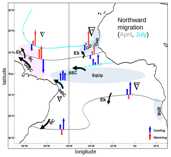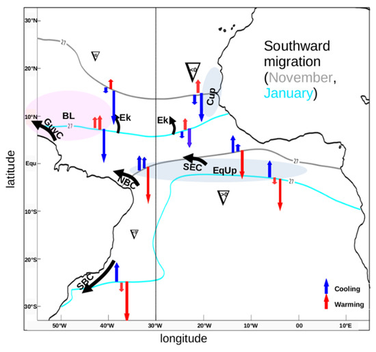 Southward migration starts in September to the north and south. For NB, there is a certain homogeneity in the mechanisms, dominated by the effects of air–sea fluxes via evaporative cooling. This displacement is significantly mitigated by oceanic processes that induce warming from November onwards in both sectors (Figure 8, grey isotherm). Subsequently, in the west, NB returns to the temperature inversion region where the ocean induces strong warming via vertical mixing and Ekman transport. In the east, the cooling effect of the vertical mixing in the Guinea Dome region diminishes rapidly as winter approaches in favor of poleward Ekman transport which mitigates the migration. For SB, the southward migration is explained by the effects of air–sea fluxes via solar heating (greater than evaporative cooling), mitigated by the strengthening of cooling by vertical mixing. In the East, SB passes again in the equatorial upwelling region where the strong vertical mixing cooling slows down the migration.