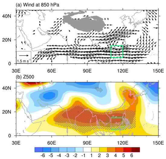 (a) Wind at 850 hPa (unit: m ) and (b) geopotential height anomalies at 500 hPa (unit: gpm) in May regressed onto the normalized time series of the SCSSM onset date for the period of 1979–2018. Only winds that are significant at the 95% confidence level are shown in (a). Dotted areas in (b) indicate that the regression coefficients are significant at the 95% confidence level. The green rectangles indicate that the region (5° N–15° N, 110° E–120° E) to define the SCSSM onset.