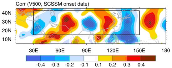 Correlation coefficients between meridional wind anomalies at 500 hPa in May and the normalized time series of the SCSSM onset date for the period of 1979–2018. Dotted areas indicate that the correlation coefficients are significant at the 95% confidence level. The black rectangle denotes the region (15° N–42.5° N, 30° E–150° E) applied to EOF analysis in Figure 3.