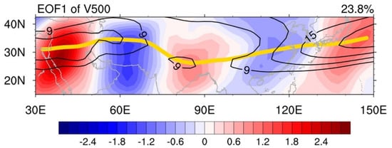 The leading EOF (EOF1) of the meridional wind anomalies (shading, unit: m ) at 500 hPa over the domain 15° N–42.5° N, 30° E–150° E and climatological mean zonal wind (contour, contour interval (CI) = 3 m )) at 500 hPa in May during 1979–2018. Only the climatological zonal winds speed 9 m are displayed. The thick yellow curve delineates the climatological jet axis.