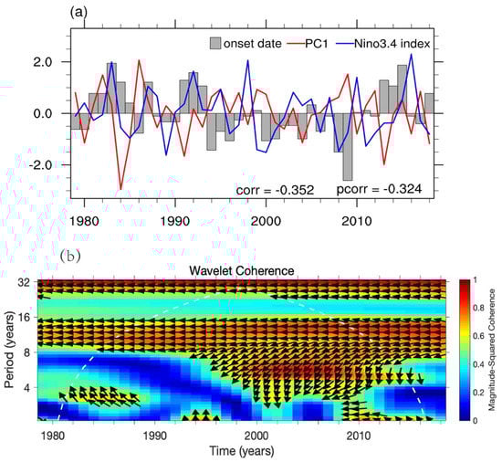 The normalized SCSSM onset date, PC1 of meridional wind anomalies at 500 hPa, and the previous winter (DJF) Niño3.4 index is further displayed in Figure 4a. The correlation coefficient between PC1 and the SCSSM onset date is −0.352, which is statistically significant at the 95% confidence level. In addition, the wavelet coherence and cross-spectrum also reveal the out-of-phase relationship between PC1 and the SCSSM onset date (Figure 4b). Namely, corresponding to the positive phase of the wave train, the SCSSM onset tends to be later. While for the negative phase of the wave train, the monsoon onset is likely to be earlier. Because ENSO is an important factor of the SCSSM onset [,,], we calculated the partial correlation coefficient between PC1 and the SCSSM onset date after removing the ENSO signal. The partial correlation coefficient is −0.324, still significant at a 95% confidence level. In conclusion, the wave train along the Asian jet is an extratropical factor that may modulate the SCSSM onset, and it is largely independent of ENSO.