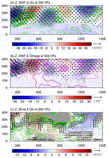 To investigate the mechanism of the SCSSM onset affected by the wave train along the Asian jet, a linear regression analysis is performed to obtain the circulation anomalies associated with the wave train. As shown in Figure 5, a clear wave train can be observed extending eastward from the South-central Mediterranean to East Asia along the Asian jet (nearly 30° N). Taking the positive phase of the wave train as an example, in the upper-troposphere, there appear positive geopotential height anomalies over Iran and western China. Meanwhile, negative geopotential height anomalies appear over Northeast Africa, Indian Peninsula, and East Asia, respectively. The wave activity flux [] propagates along the Asian jet eastward from the south-central Mediterranean (Figure 5a). The distribution of geopotential height anomalies and the wave activity flux at 500 hPa are similar to that at 200 hPa, but the significant negative geopotential height anomaly near the Sea of Japan extends South-west to the SCS (Figure 5b). At 850 hPa, except that the negative geopotential height anomaly becomes not obvious in Northeast Africa and disappears in Indian Peninsula, other anomaly centers still exist. Particularly, a negative geopotential height anomaly still extends from the Sea of Japan to the SCS (Figure 5c). The geopotential height anomalies associated with the wave train are similar at different levels, indicating that the wave train has an equivalent barotropic structure in the vertical, which is consistent with previous studies [,]. The negative geopotential height anomalies over the WNP and the SCS in May induced by the wave train facilitate the weakening and eastward retreat of the WNP subtropical high, which is an important circulation system for interannual variability of the SCSSM onset [,]. Simultaneously, the low-level anomalous cyclone over the Philippine Sea and the SCS also contributes to the weaker WNP subtropical high, and the anomalous westerly on the south of the anomalous cyclone is conducive to the reversal of the low-level wind from easterly to westerly (Figure 5c). Besides, the convergence in the lower-troposphere and the divergence in the upper troposphere over the Philippine Sea are favorable for the anomalous ascending motions, resulting in the weakening of the WNP subtropical high. The weakened WNP subtropical high is favorable for the anomalous westerly into the SCS, contributing to the earlier onset of the SCSSM. In contrast to the positive phase, the negative phase of the wave train is advantageous to the enhancement and westward extension of the WNP subtropical high, which promotes the intrusion of easterly over the SCS, leading to the later onset of the SCSSM.