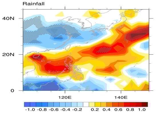 It is known that the increase in rainfall over the SCS is an important characteristic of the SCSSM onset []. The rainfall in May is regressed onto the normalized PC1 to examine the rainfall anomaly induced by the wave train (Figure 6). The regressed rainfall field shows positive anomalies over the SCS, indicating that the positive phase of the wave train is conducive to the occurrence of rainfall over the SCS in May. The positive rainfall anomalies are consistent with the circulation anomalies, which present an anomalous cyclone with the ascending motions over the SCS and the Philippine Sea (Figure 5), promoting the earlier SCSSM onset.