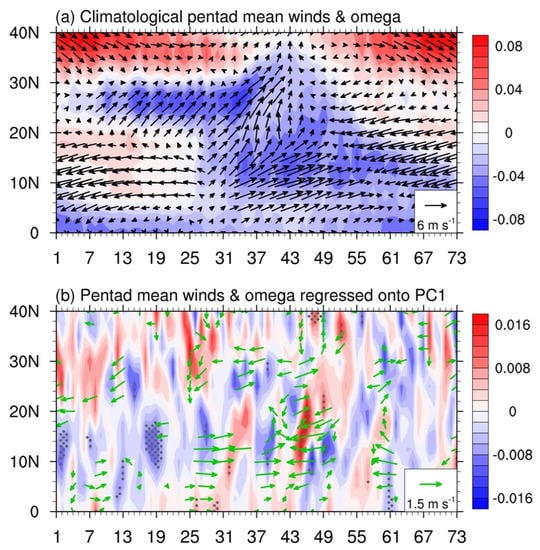 (a) Climatological pentad mean horizontal winds (vector, unit: m ) and pentad mean 850–500 hPa omega (shading, unit: Pa ) for the period of 1979–2018. (b) pentad mean horizontal winds and pentad mean 850–500 hPa omega regressed onto the normalized time series of PC1. The data are averaged across the SCS over the longitude between 110° E and 120° E. Dotted areas and green vectors indicate that the regression coefficient of omega and horizontal winds are significant at the 90% confidence level in (b).