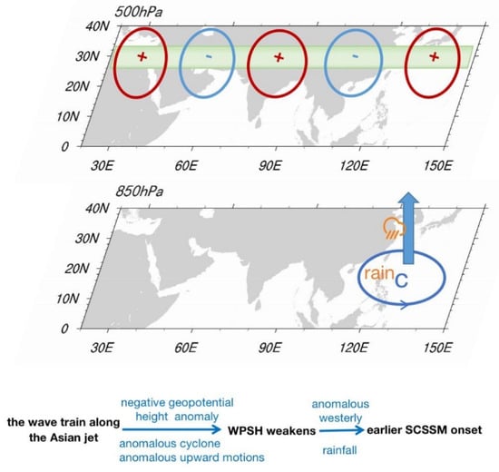 Figure 8 illustrates the possible mechanism of the SCSSM onset affected by the wave train along the Asian jet in May. Taking the positive phase of the wave train as an example, the wave train could induce the negative geopotential height anomalies over the SCS and the WNP in the mid-troposphere. There also appears to be a significant anomalous cyclone over the SCS and the Philippine Sea in the lower troposphere. Moreover, anomalous ascending motions exist over the SCS and the Philippine Sea. The above circulation anomalies lead to the weakening of the WNP subtropical high. In particular, the anomalous ascending motions are conducive to the occurrence of rainfall over the SCS, and the anomalous westerly on the south side of the anomalous cyclone favors the firm establishment of the westerly. The combined effects of these aspects create a favorable atmospheric environment for the earlier SCSSM onset. The positive phase of the wave train could make the onset date earlier by weakening the WNP subtropical high. Contrary to the positive phase, the negative phase of the wave train could delay the SCSSM onset by strengthening the WNP subtropical high.