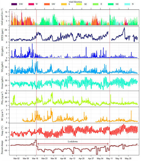 - Guevara, M.; Jorba, O.; Soret, A.; Petetin, H.; Bowdalo, D.; Serradell, K.; Tena, C.; Denier van der Gon, H.; Kuenen, J.; Peuch, V.-H.; et al. Time-Resolved Emission Reductions for Atmospheric Chemistry Modelling in Europe during the COVID-19 Lockdowns. Atmos. Chem. Phys. 2021, 21, 773–797. [Google Scholar] [CrossRef]