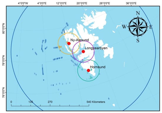 The measurements were conducted in the distance of 500 km from Longyearbyen, chosen as a central point in the studied area. Within the Svalbard archipelago, three sites were specified: Ny-Ålesund (Nya), Longyearbyen (Ly), and Hornsund (Hor). Then, the data was divided by the buffer of each land location (Hornsund, Longyearbyen, Ny-Ålesund) within a distance of 75 km for each station. Those sectors were named after each station’s area. The boundaries of these areas are mapped in the figure below (Figure 1). The rest of the measurements were named as the open waters station.