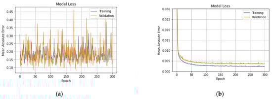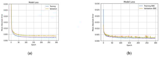 BBEs are significant contributors to atmosphere pollutants, specifically aerosol particles in the Arctic region. In an attempt to improve AOD prediction accuracy, seven days’ worth of biomass burning event (BBE) data before the date of each determined AOD value was added to the DNN parameter list to account for long wind transport. Upon addition of the BBE data, a significant improvement was observed with an MAEtraining of 0.002339 (MAEval = 0.002562) when BBE data was included, as compared to an MAEtraining of 0.00401 (MAEval = 0.00443) in the absence of BBE data over 300 epochs (Figure 3). Therefore, the inclusion of BBE data decreased the MAEtraining value by 0.001671 and decreased the MAEval by 0.001738. Using this difference, the MAEtraining after the inclusion of BBE data was 42.167% less than the previous model without BBE data.