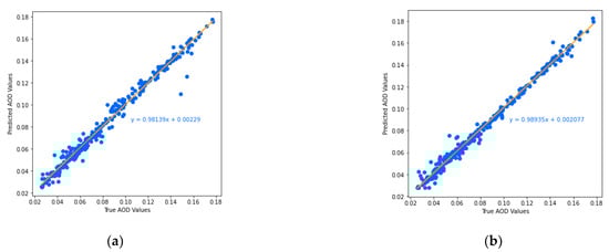 True AOD values vs. predicted AOD values for (a) −BBE and (b) +BBE.