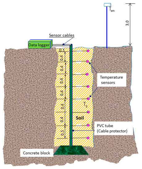 The experiment was conducted at the Agricultural Research and Experiment Station, Agriculture Engineering Department, King Saud University (Riyadh, Saudi Arabia; 46″43′ E longitude and 24″38′ N latitude). The soil at the site of the experiment, as well as that of most of arid regions such as the Arabian Peninsula, is composed of gravelly sand and dries up to a 5-m depth or more. Therefore, mechanical digging was used to prepare a hole with a surface area of about 1 m2 and a depth of 3.5 m. In order to protect the cables of temperature sensors in the soil, these cables were collected to pass through a 5-cm diameter PVC pipe, installed vertically and fixed at the bottom of the hole with a concert block (Figure 1).