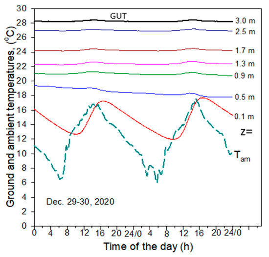 Diurnal variation in ambient temperature (Tam) and underground soil temperature (Tg) at different depths (z) in winter season (29–30 December 2020).