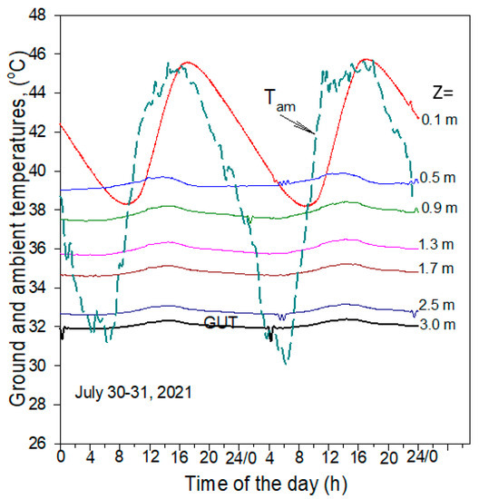 At a 3-m depth, the annual variation in Tg was minor and it can be considered as the ground undisturbed temperature, GUT. The GUT value was 29 °C in winter and 32 °C in summer; these values are adequate for cooling/heating purposes in a climate in which the ambient air temperature drops below 10 °C on winter nights and exceeds 47 °C on summer days. For an EAHE operating under ideal conditions, the geothermal energy level can provide a maximum cooling/heating potential of 890/1000 MJ per m3 of flowing air per day.