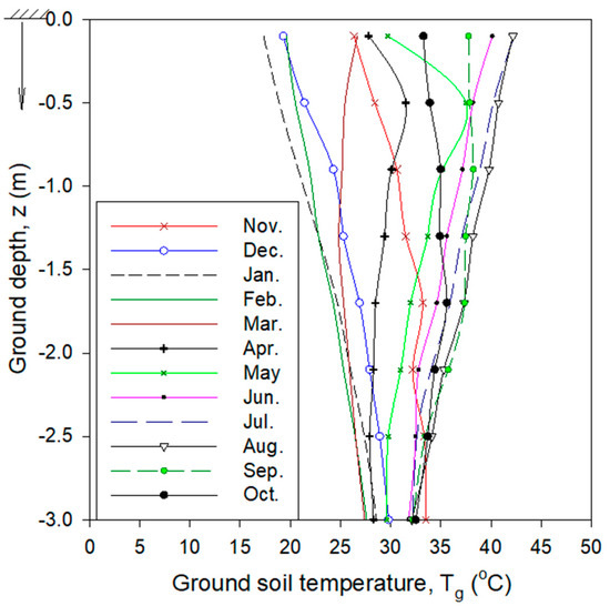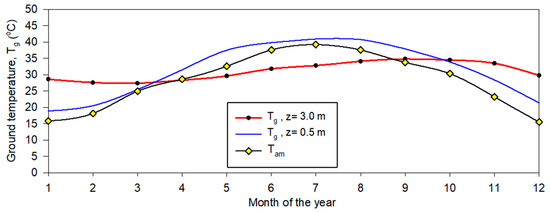 where Tg (z,t) is the soil temperature at depth z and month number t; Tm is the annual mean soil surface temperature (°C); Tamp is the amplitude of the soil surface temperature [(max − min)/2] in (°C); z is the depth below the ground surface (m); αs is the ground soil thermal diffusivity (m2/month); t is time (the month number that the ground temperature is calculated for); to is the time shift (month of the year of the lowest ground surface temperature). For the desert of the KSA, the value of αs was estimated as 2.736 (m2/month) and thermal conductivity of soil as 2.2–2.8 (W m−1 °C−1) [7,8]. From 1 November 2020 to 31 October 2021, the values of Tm and Tamp were estimated (from measurements) to be 30 and 12 °C, respectively. Moreover, in January, the lowest ground surface temperatures were recorded; then, in Equation (1), is equal to one.