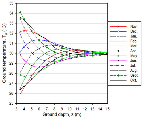 As farther digging in the desert of arid regions is quite difficult and expensive, we used Equation (1) to predict the monthly average values of Tg at different depths. To calculate the values of Tm and Tamp in Equation (1), the measured Tg at the 0.1-m depth was considered as the soil surface temperature. The predicted results for 12 months and depths of >3 m are plotted in Figure 6. As illustrated in Figure 6, at a depth (z) greater than 13 m, Tg becomes constant at 30 °C throughout the year. As the arid climatic condition is almost similar every year in the deserts of KSA, the GUT can be considered constant at 30 °C throughout the year at a depth greater than 13 m.