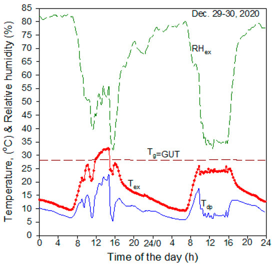 Diurnal variation in estimated dew-point temperature (Tdp) of air ventilated from a greenhouse at Tex and RHex and flowed through EAHE pipes buried at the GUT in winter season (29–30 December 2020).