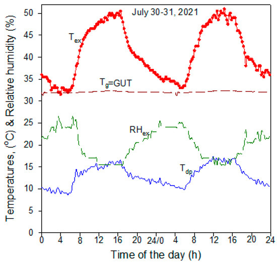 Diurnal variation in estimated dew-point temperature (Tdp) of air ventilated from a greenhouse at Tex and RHex and flowed through EAHE pipes buried at the GUT in summer season (30–31 July 2021).