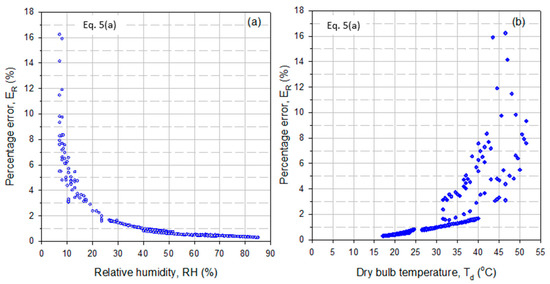 Percentage error, ER (%), in the approximated value of Tdp (estimated by using Equation (5a)) as affected by (a) relative humidity (RH) and (b) dry bulb temperature (Td).
