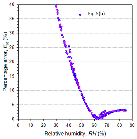 Similarly, Tdp was calculated using Equation (5a,b) to check the validity of these approximations to be used to calculate Tdp for an arid climate. The percentage error, ER (%), was calculated in each case as ER (%) = abs{(Taccurate-Tapproximate)/Taccurate} × 100. The values of ER (%) were calculated for a wide range of Td and RH and are plotted in Figure 9a,b for Equation (5a) and in Figure 10 for Equation (5b). Based on Figure 9a,b, Equation (5a) can be used to calculate Tdp with an error less than 1% for RH > 40% and Td < 30 °C. However, Equation (5b) can be used only for RH > 60% with an error of about 3–4%; for low RH values (as in the arid climate), such an approximation (Equation (5b)) cannot be used. Accordingly, for arid climatic conditions (as in the Arabian Peninsula region), such approximations (Equation (5a,b)) are not recommended and Equation (7) is the appropriate correlation to determine Tdp correctly.