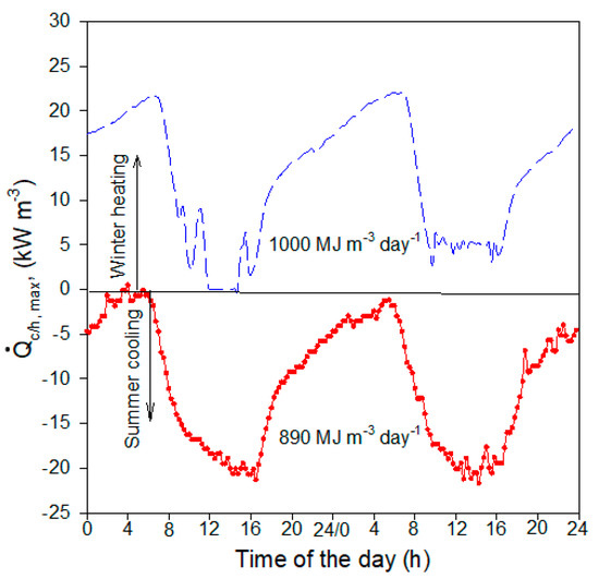 Diurnal variation in maximum cooling/heating capacity () that an EAHE can provide and the maximum cooling/heating potential per day.