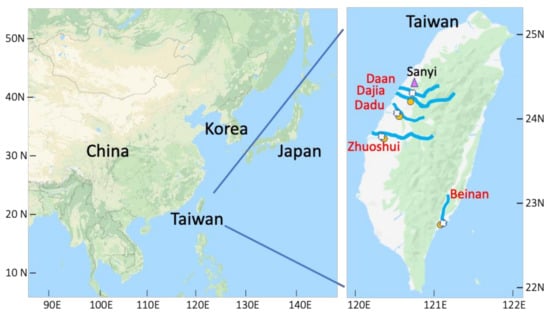 Taiwan is an island located off the southeast coast of the Asian continent. Many rivers in Taiwan originate from high mountains, with the highest elevation of nearly 4000 m, and are meridionally situated in the middle of the island (Figure 1). The rivers on the island are separated by the high mountains and flow either eastward or westward into the sea. Because the rivers are short and steep, the water flow is usually rapid. In addition, in the source regions, most of the geological textures of the rivers are composed of sandstone, shale, and slate. These textures are fragile and collapse easily, leading to a large amount of river sedimentation. When heavy rains occur, these sediments can be carried downstream by the rivers. As the flow rate slows down, the suspended matter in the water gradually settles and accumulates. Once the weather is dry and the wind speed is strong, the small debris on the riverbed can be raised by the wind and suspended in the air.