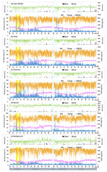 Figure 2. Wind speed and direction, relative humidity (orange line), temperature (pink line), and PM10 concentration observed at the (a) Daan and Dajia, (b) Dadu, (c) Zhuoshui, and (d) Beinan riverbed monitoring stations, and rainfall amounts observed at the closest general EPA stations adjacent to the rivers from 1 September 2010 to 31 August 2011, and 1 September 2012 to 31 August 2013. Observations from (e) Sanyi background station are plotted for comparison. Two selected events for discussion are marked with yellow bars.