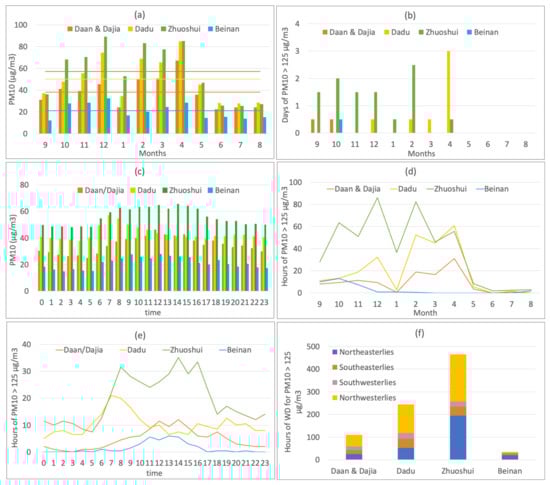Figure 3b counts the total number of days in which the daily averaged PM10 of all riverbeds exceeded the air quality standard of 125 µg m−3 in each month. The results showed that the daily average PM10 exceedance time of all rivers was within 3 days per month, of which the maximum 3 days was observed in the Dadu River in April. In addition, for the entire year, the maximum number of 10 days was observed in the Zhuoshui River. This is because in the Zhuoshui River, the daily PM10 exceeds the standard for nearly half a day to 2.5 days per month in the winter. On the other hand, the Daan/Dajia Rivers exceed the standard value for half a day in September and October, while the Beinan River only exceeds the standard for half a day in October. The low daily average PM10 exceedance time of all rivers in Figure 3b indicates that the high riverbed concentrations occur sporadically within a few hours, and the background concentration of the rivers is relatively low during the rest of the day, and thus the daily average PM10 is not high.