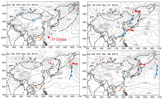 Figure 4 shows the weather maps of the first events of the typhoon and non-typhoon types, in which the latter is further classified into ahead of front, ahead of anticyclone, and behind anticyclone. In Figure 4a, the first typhoon type was observed on 27 October 2010 (also see Table 1). In this event, Typhoon Chaba approached Taiwan from near the equator, and later turned northeast to the Japanese coast without passing through Taiwan. On the other hand, a strong anticyclonic circulation occupied China on the same day, and there was an intensive pressure gradient in the coastal areas of China. Due to this strong pressure gradient, strong northeasterly winds prevailed in Taiwan. The approach of the cyclonic circulation of the typhoon accelerated the strong northeasterlies, resulting in the rising of the riverbed sands and dust particles, and has led to the daily PM10 exceedance over the Daan/Dajia and Zhuoshui Rivers (Table 1). Although typhoons are warm and humid cyclones, and often produce rainfall, Typhoon Chaba was far away from Taiwan, so less than 1 mm of precipitation was observed in southeastern Taiwan, and no precipitation was observed in the riverbed area of Central Taiwan.