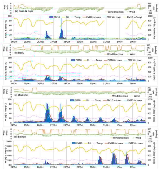 After the typhoon, the PM10 concentrations of most rivers decreased, but the opposite occurred in the Beinan River (Figure 5d). From 30 October to 2 November 2010, high PM10 concentrations were observed in the Beinan River at noon time, and the maximum concentration exceeded 500 µg m−3. The wind speed on these days only reached around 4 m s−1, and was less than the peak wind speed (close to 5 m s−1) during the typhoon period. However, the Beinan River is located on the southeastern coast of Taiwan, directly facing the warm and humid air brought by the typhoon’s peripheral circulation, which suppressed the uplifting of dust particles from riverbeds. After the typhoon left, the northeast monsoon followed and the relative humidity decreased to a minimum below 40%. Thus, the riverbed dust particles were uplifted under windy and dry conditions, showing the importance of humidity as a factor. In addition, Figure 5d shows that the PM10 concentration in the town near the riverbed increased during this period. Similarly, the PM10 concentrations in towns near other riverbeds also increased during the typhoon period (Figure 5). Since the concentration of PM2.5 in towns and PM10 in the background Sanyi station were both low during the event, indicating low local pollution or foreign dust concentrations. The high PM10 concentration in towns suggests that the coarse particles from riverbeds have affected those nearby towns.