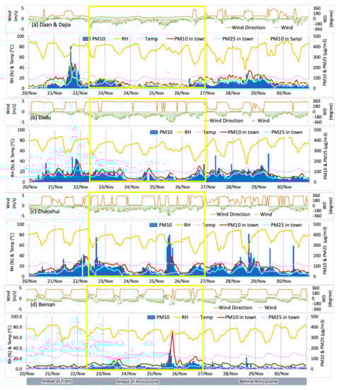 The second selected weather type is without typhoon, which occurred from 20 November to 30 November 2010, and Figure 6 shows the observed data of this type. In this type, three meteorological stages were observed, including ahead of a surface front, ahead of an anticyclonic system, and behind an anticyclonic system. At the beginning of this type on 21 November, a surface front was approaching Taiwan (Figure 4b). At this time, the wind speed was low and the atmosphere was stable. In addition, due to the approach of the cyclonic circulation of the low-pressure system, southwesterly winds were easily seen in some areas of Western Taiwan [36], causing the pollutants to accumulate over the marginal sea and northwestern Taiwan (Figure S1). In the riverbed area of Central Taiwan, the sea breeze from the northwest prevailed at noon time, bringing pollutants into the riverbed areas (Figure 6a–c). Under the northwesterly wind, high PM10 concentration was observed over the Daan/Dajia Rivers, with the maximum value exceeding 400 µg m−3 (Figure 6a). Since concentrations of PM10 in the Sanyi background station and the PM2.5 in riverside towns were both about 200 µg m−3 at the same time, it suggests that other than the riverbed dust raised by the wind speed, the pollutants carried by the westerly wind affected the riverbeds of the Daan/Dajia Rivers and surrounding areas. The PM10 concentration of other rivers in Central Taiwan also increased, but the time was slightly delayed from north to south (Figure 6b,c).