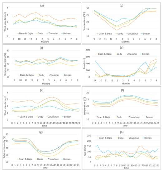 Figure 7. Monthly and hourly mean (a,e) wind speeds, (b,f) temperatures, and (c,g) relative humidity obtained from riverbed monitoring stations, and (d,h) rainfall amounts obtained from the closest EPA monitoring stations adjacent to each of the riverbed stations.