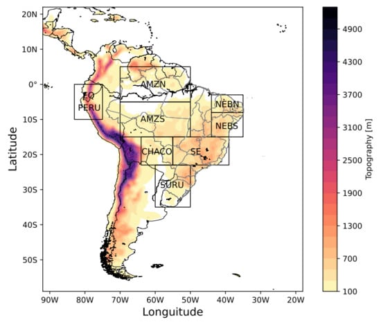 Domain and topography (m) used in the WRF simulations. The squares indicate the limits of sub-domains investigated. The abbreviations used in the map correspond to: Amazon basin NORTH (AMZN); Amazon basin SOUTH (AMZS); northeast of Brazil—NORTH (NEBN); northeast of Brazil—SOUTH (NEBS); southeast of Brazil (SE); south of Brazil and Uruguay (SURU); Chaco Region (CHAC), and Peru-Equator (PEQU).