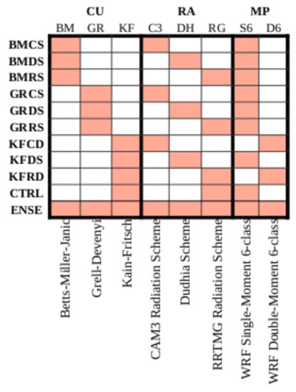 A total of 10 simulations were run, corresponding to the 10 different model configurations (see Figure 2). The ensemble mean was also evaluated. The ensemble mean experiment was generated from the mean of ten individual members. Three convection schemes were used, namely the Kain–Fritsch (KF) [,], Grell–Devenyi (GR) [], and Betts–Miller–Janjic (BM) []. Three radiation schemes were used as well, the newer version of the rapid radiative transfer model (RG) [], Dudhia scheme (DH) [], and CAM scheme (C3) []. As for the microphysics, we evaluated the WRF single-moment six-class scheme (S6) [] and WRF double-moment six-class scheme (D6) []. We considered the control simulation (CTRL) as the combination of KF cumulus scheme, RG radiation scheme, and S6 scheme for the cloud microphysics, which is the mostly employed model setup in operational forecasting in the SAC domain. For each model configuration, there is one or more model configurations that differ in just one of the parameterizations, allowing to evaluate the effect of changing each one in isolation.