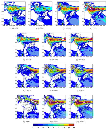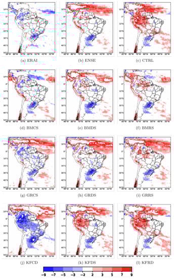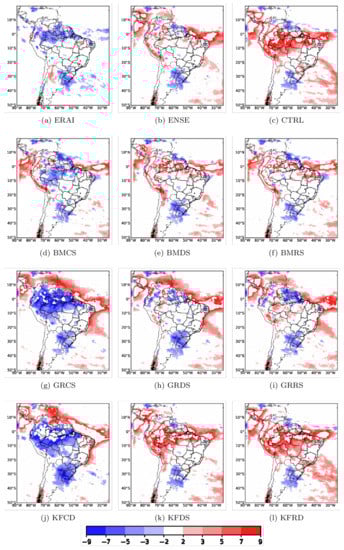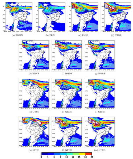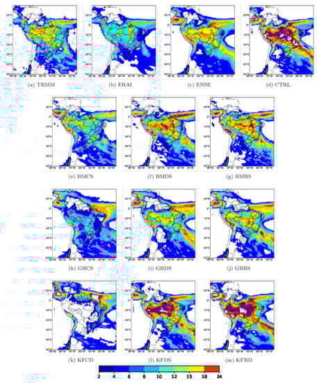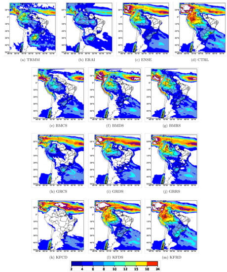 With respect to the wet trimester DJF (Figure 3), it is possible to see that TRMM and the reference cases agree, with respect to the spatial pattern of precipitation, but clearly disagree with respect to their precipitation volumes. While CTRL overestimates the observed values, ERAI underestimates it, and the ENSE of simulations is closer to TRMM than both CTRL and ERAI. This improvement of ENSE is an important result, and demonstrates that an ensemble based on physical parameterizations, plus the finer resolution was capable of providing more accurate results than the reanalysis fields from ERAI. Looking onto specific members (lines 2–4 of plots), it is possible to see that the general spatial pattern of precipitation is correct for most of them, except for GRCS and KFCD that largely underestimated rain in the center of SAC, and KFDS/KFRS, whose results went in the opposite direction i.e., largely overestimated precipitation. The results for the Kain–Fritsch parameterization are surprising, and they suggest that it is the combination of radiation and microphysics that determines precipitation fields when KF is the chosen cumulus parameterization. Given that microphysics at the resolution of 50 km is a weak forcing, and that convective storms dominate the scene in the wet season in SAC, it seems that the radiation choice is the critical parameter when KF is employed.