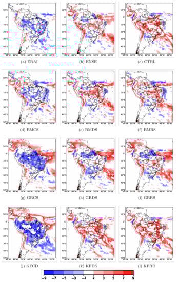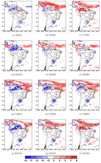 Finally, in the dry-to-wet transition quarter of SON (Figure 10), it is noteworthy the ERAI and ENSE low deviations in continental areas (except for the underestimation in SURU). However, ENSE produced significant positive deviations in the north of the Atlantic ocean (ITCZ area). Either way, both got results far superior to the CTRL experiment, which resulted in significant portions of the Amazon basin with negative deviations. Among the individual members, the KFCD experiment presented a large area with negative deviation in the continental portion of the domain. Interestingly, this pattern was not followed by the other C3 schemes (on the left column—as observed in the DJF quarter; Figure 7). A possible explanation for this behavior is that the convection schemes in BMCS and GRCS were partially able to counterpart the bias induced by C3 in SON, but not in DJF. Further investigation is necessary to corroborate (or not) this hypothesis.