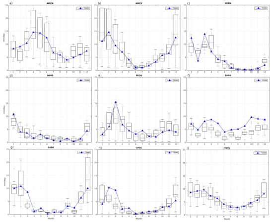 Direct comparison of the annual cycle of simulated ensembles and observations for the eight areas investigated in this study [(a) AMZN, (b) AMZS, (c) NEBN, (d) NEBS, (e) PEQU, (f) SURU, (g) SUDE, (h) CHAC], plus the average over all areas [(i) TOTL]. Box plots represent the statistical spread of monthly precipitation for all nine members + CTRL. Here, they follow the standard format of box plots, i.e., boxes represent quartiles, and whiskers are of 1.5 interquartile range, far from the box limits. Red crosses represent outliers outside this range. The blue line corresponds to TRMM data.