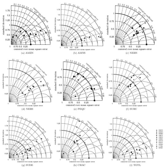 Taylor diagrams for area-averaged monthly precipitation in regions (a) AMZN, (b) AMZS, (c) NEBN, (d) NEBS, (e) PEQU, (f) SURU, (g) SUDE, (h) CHAC, and (i) TOTL shown in Figure 1. The reference (TRMM) data are shown by the closed circle along the horizontal axis. The individual experiments are shown by different forms.